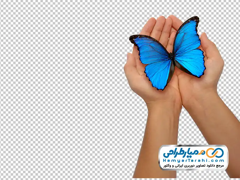 دانلود فایل png پروانه آبی نشسته روی دست