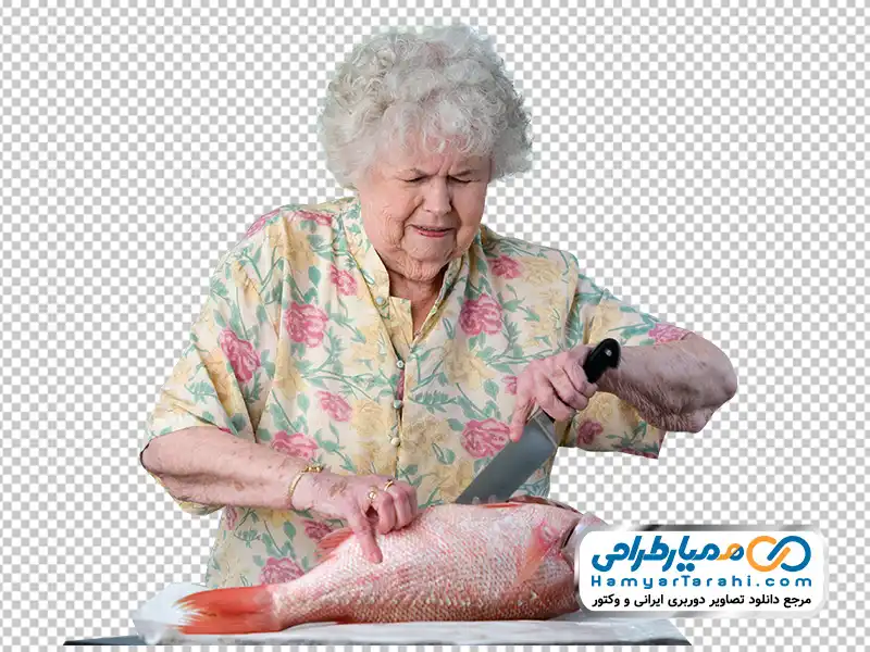 تصویر png خانم مسن در حال پاک کردن ماهی