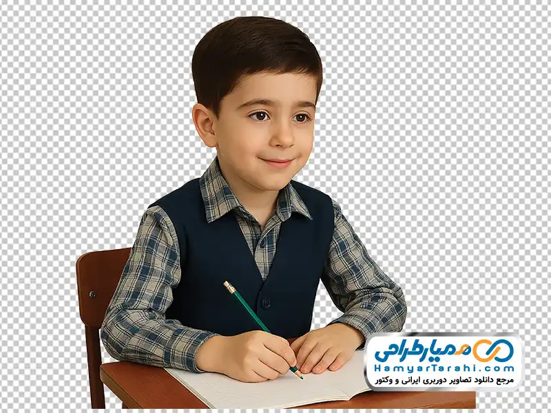 تصویر png پسر بچه دبستانی پشت میز مدرسه