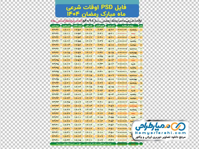 دانلود طرح لایه باز جدول اوقات شرعی ماه رمضان سال 1404، را با بهترین کیفیت دانلود کرده و در طراحی از آن استفاده کنید.