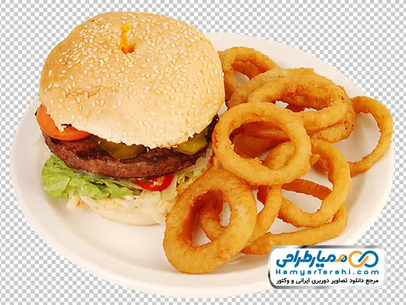 دانلود فایل png همبرگر داخل بشقاب با پیاز سوخاری