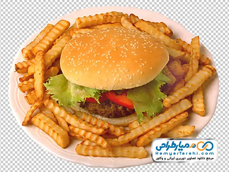دانلود فایل png همبرگر داخل بشقاب با سیب زمینی سرخ شده